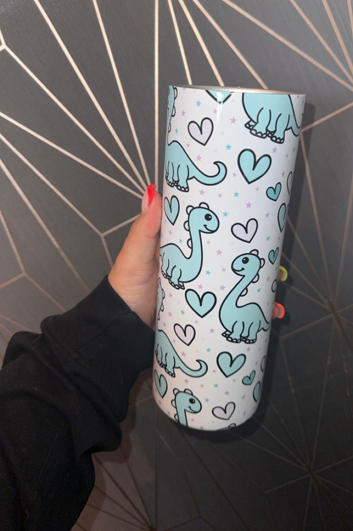 Sip your favourite beverages in style with our adorable Blue Dino with Hearts 20oz tumbler! Featuring a playful blue dinosaur surrounded by vibrant heart accents, this tumbler is the perfect blend of cute and functional. Whether you're at home, on the go, or at the gym, this tumbler will keep your drinks at the perfect temperature and brighten your day with its cheerful design.