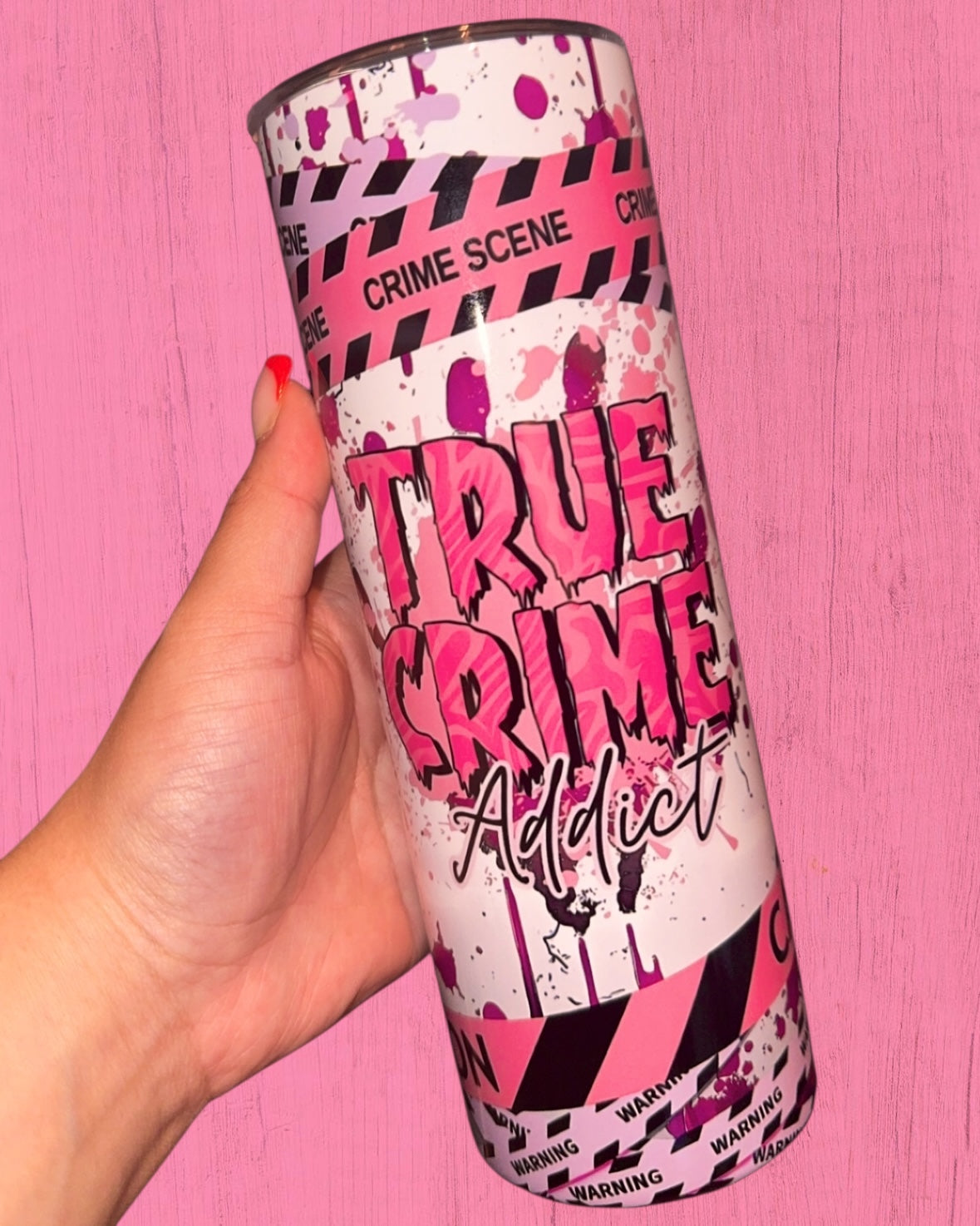 For fans of mystery, intrigue, and a pop of colour, the True Crime Pink 20oz Tumbler is the perfect accessory. Featuring a bold and eye-catching pink design paired with chilling true crime graphics, this tumbler lets you sip your favourite drink while indulging in your love for all things spooky and suspenseful. Whether you're on a true crime binge or just need a little caffeine to fuel your investigations, this tumbler keeps your drinks hot or cold for hours, adding a dash of thriller vibes to your day.